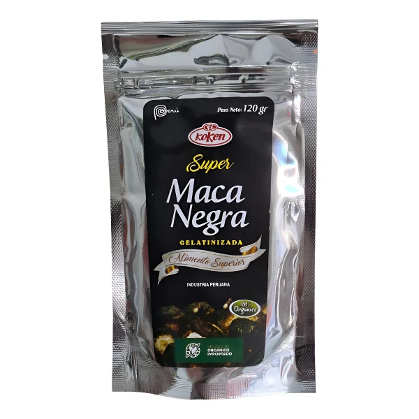 Super Maca Negra Orgánica Peruana Koken es un suplemento alimenticio en polvo que destaca por su pureza y calidad. Elaborado con maca negra orgánica, este producto es ideal para quienes buscan un impulso energético natural y un apoyo nutricional en su dieta diaria. Su formato en sachet de 120 gramos facilita su uso y almacenamiento, permitiendo disfrutar de sus beneficios en cualquier momento.